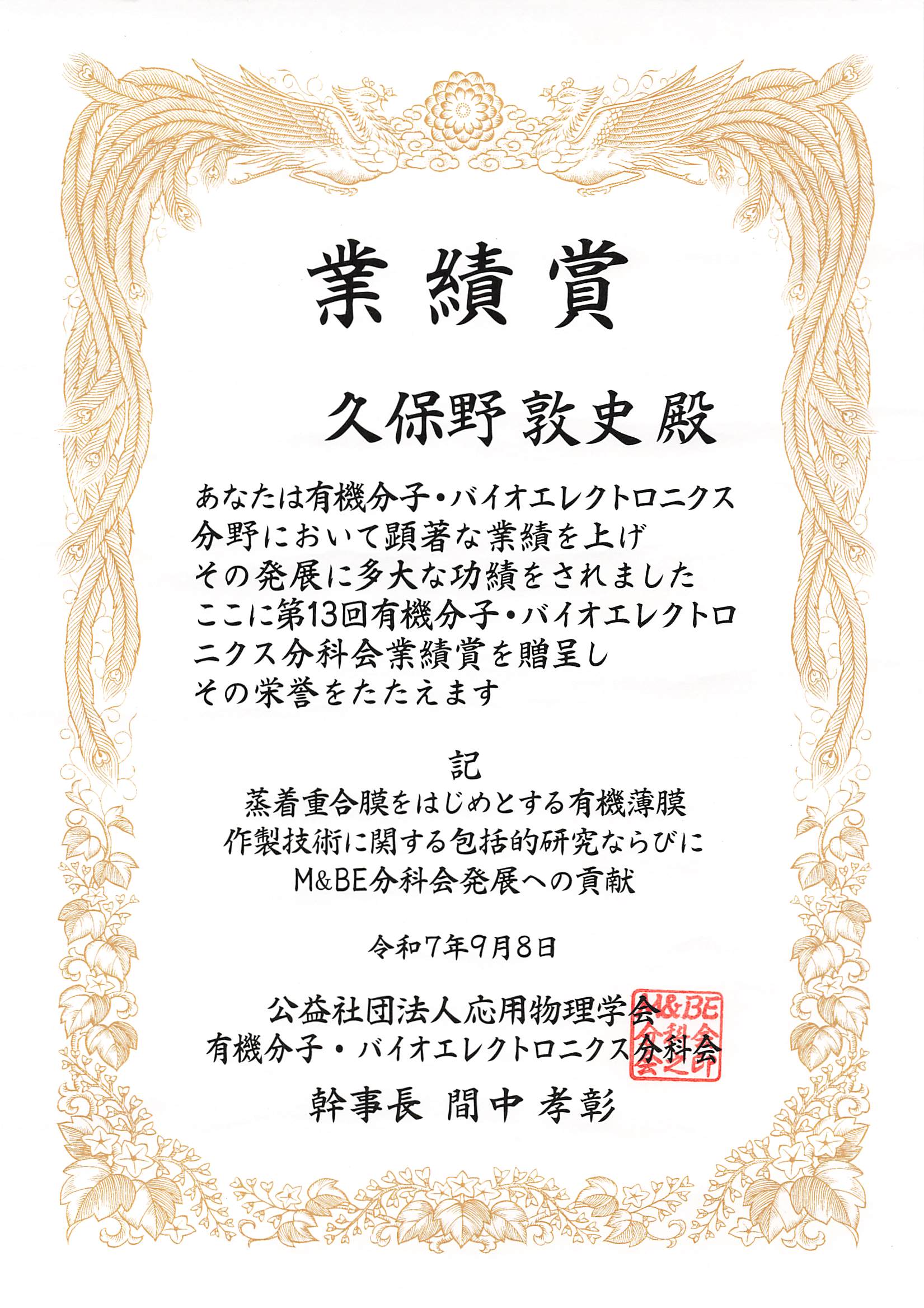 久保野 敦史 教授(電子物質科学系列)が、有機分子・バイオエレクトロニクス分野における顕著な業績とその発展への多大な功績について評価され、応用物理学会第13回有機分子・バイオエレクトロニクス分科会業績賞を受賞しました。